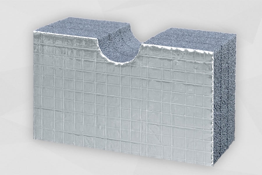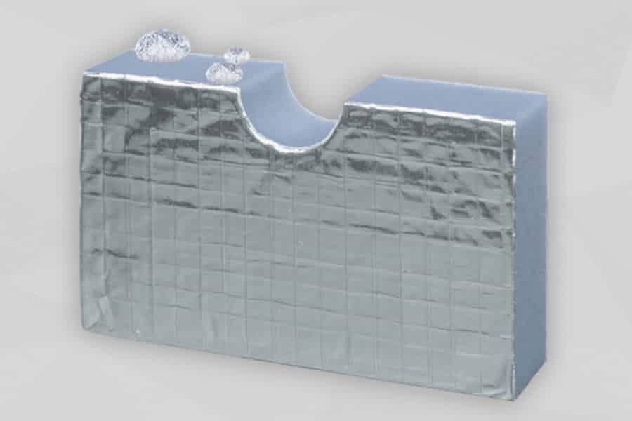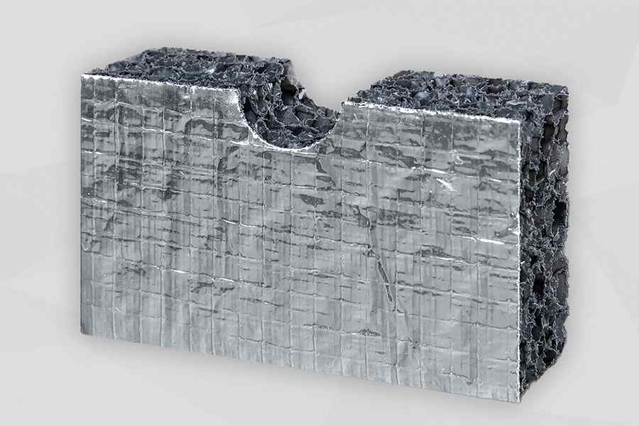 Yırtılma direncini artırmak için ince bir alüminyum folyo ile lamine edilmiş, kapalı hücreli, ses emici düşük yoğunluklu polietilen sünger.
